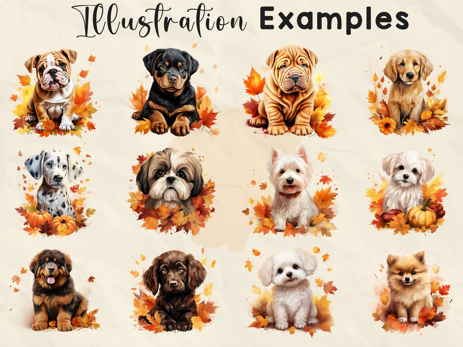 🐾 111 breeds including small, medium, and large dogs illustrated in beautiful fall themes